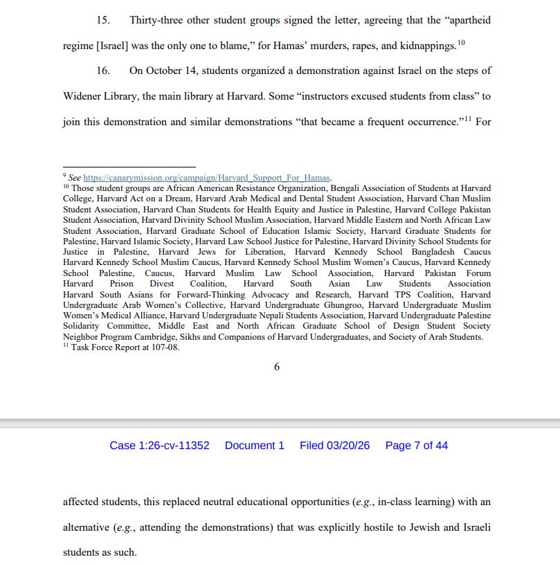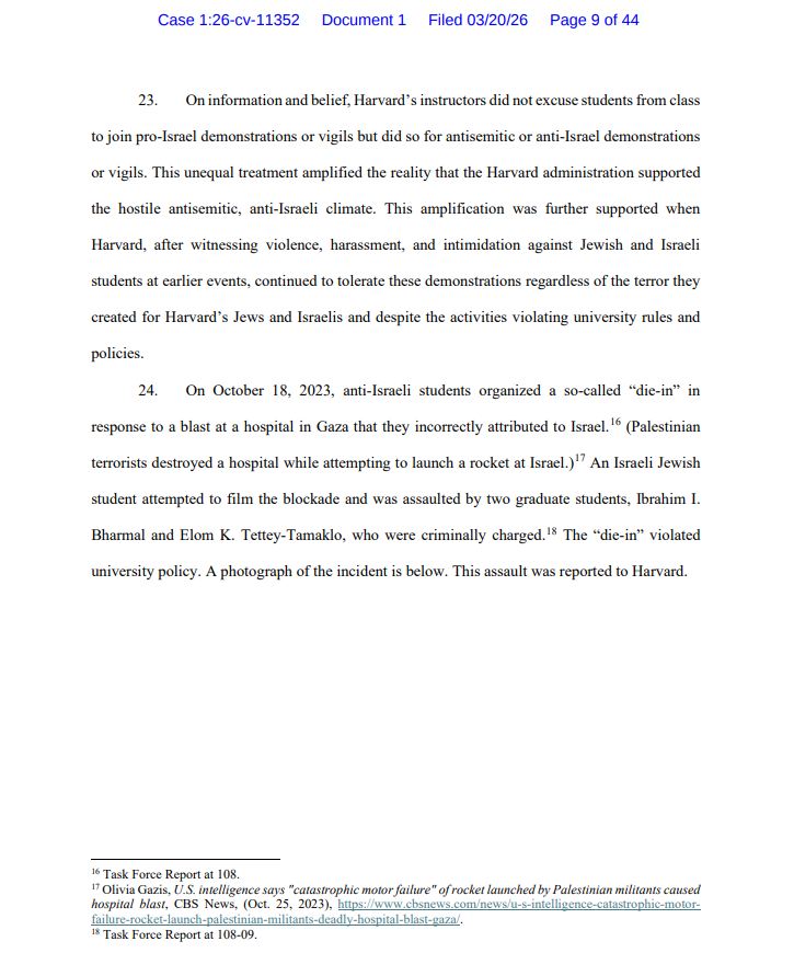В этом иске не утверждается, что Гарвард нарушает [анти-дискриминационные законы] тем, что не пресекает мирные протесты, вызывающие недовольство у студентов-евреев и студентов-израильтян.