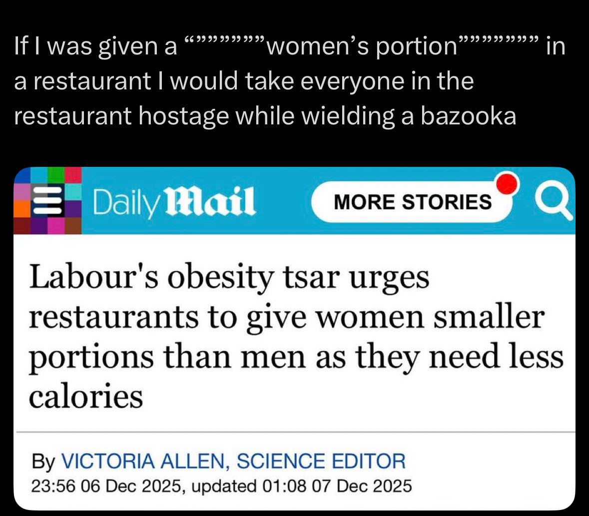 Во втором лейбористы предлагают давать женщинам в ресторане меньшие порции для борьбы с ожирением.