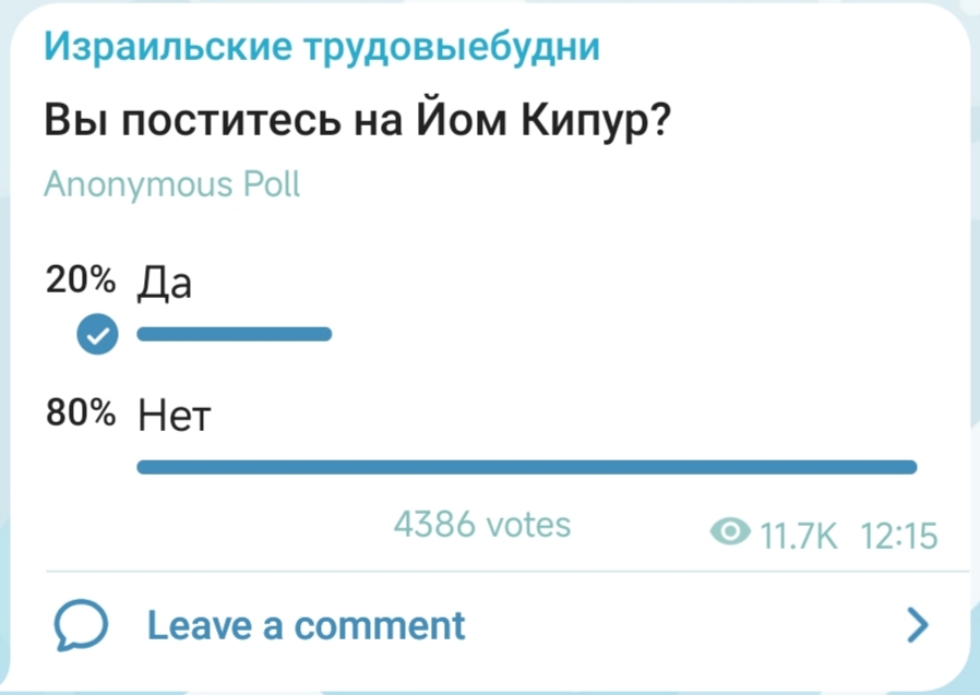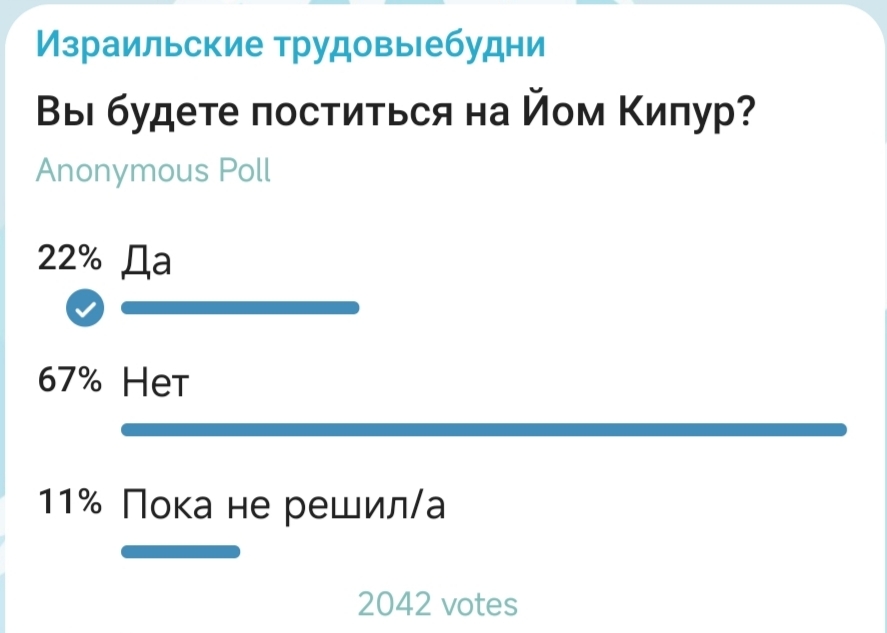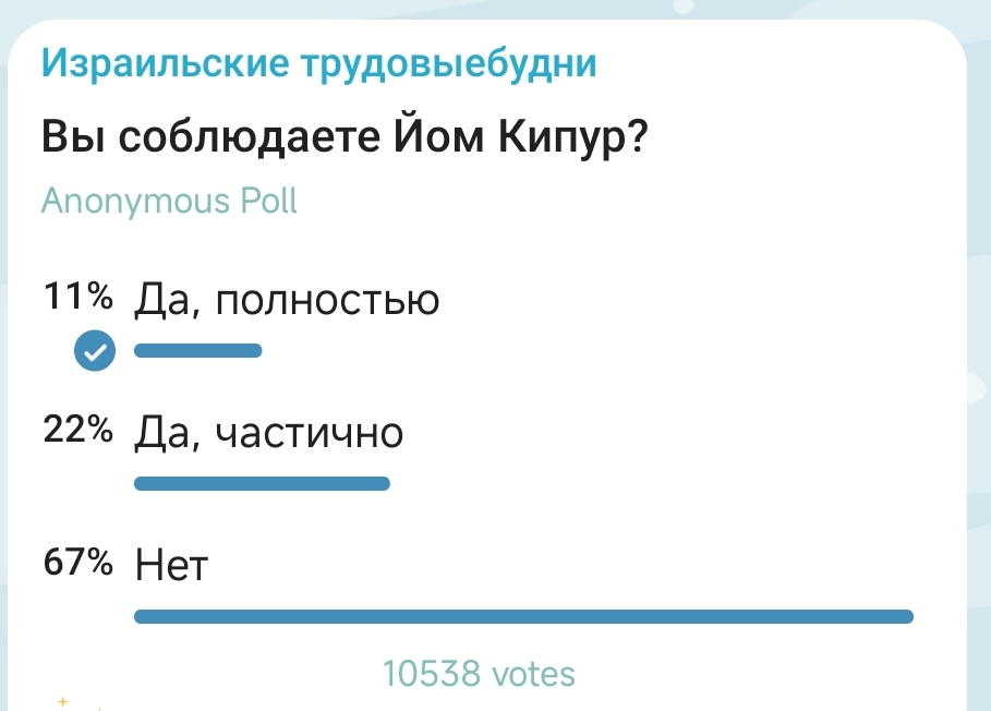У моих детей цифры конечно другие, но так же соблюдают Йом Кипур, а младший вообще начал держать пост лет в десять или одиннадцать. Он такой-же светский человек, как и я, но считающий, что "живёт в государстве Алахи".