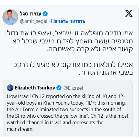 "Вот как 12-й канал сообщил об убийстве двух детей 10 и 12 лет сегодня в Хан-Юнис", - написала Цурков на английском. "ЦАХАЛ: “Сегодня утром ВВС ликвидировали двух подозреваемых на юге сектора, пересекших желтую линию". Затем она пояснила, что речь идет о самом просматриваемом канале в Израиле. Сегаль атаковал Цуркову и написал: "Какая удивительная страна Израиль, которая предпринимает все усилия ради освобождения из плена самых ярых ее хулителей - плена в который они попали вовсе не по вине государства Израиль". Сегаль добавил: "Даже мрази вроде Цурковой не заслуживают гнить в плену у террористических организаций".