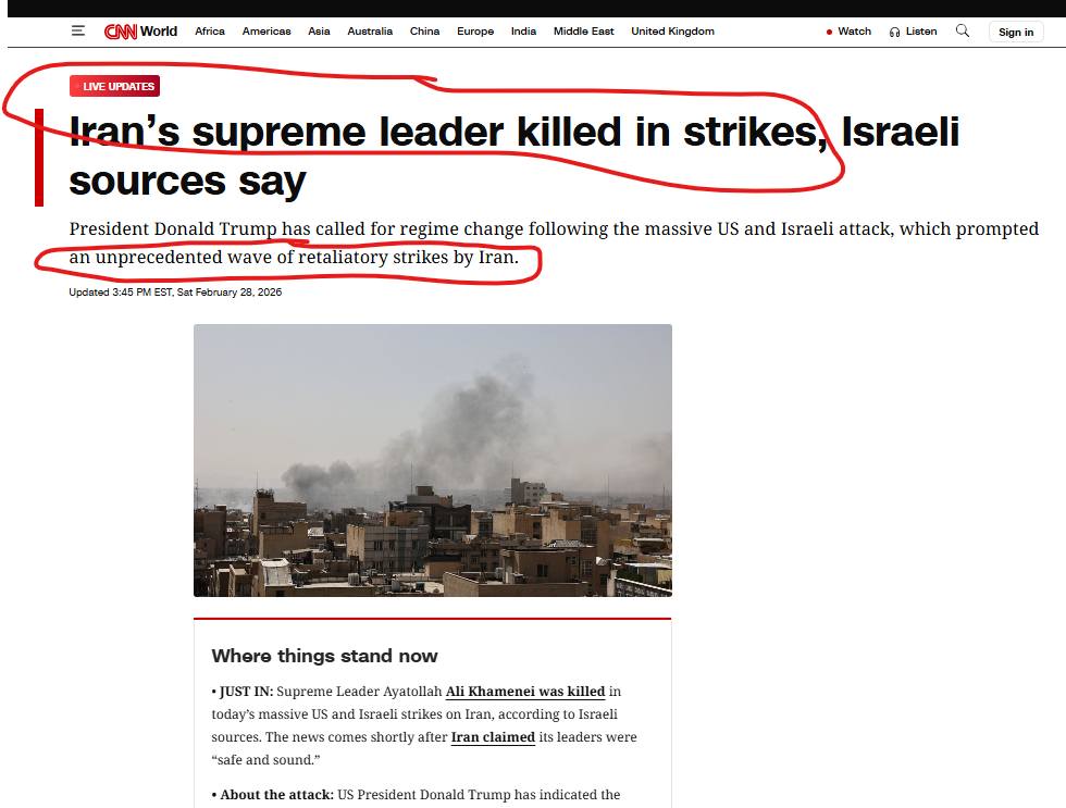 Вот как на картинке 1. Казалось бы, огромная новость — убит Хаменеи! (ну, или пока такая инфа). Вот о ней и пишите. Вот ее и анализируйте.