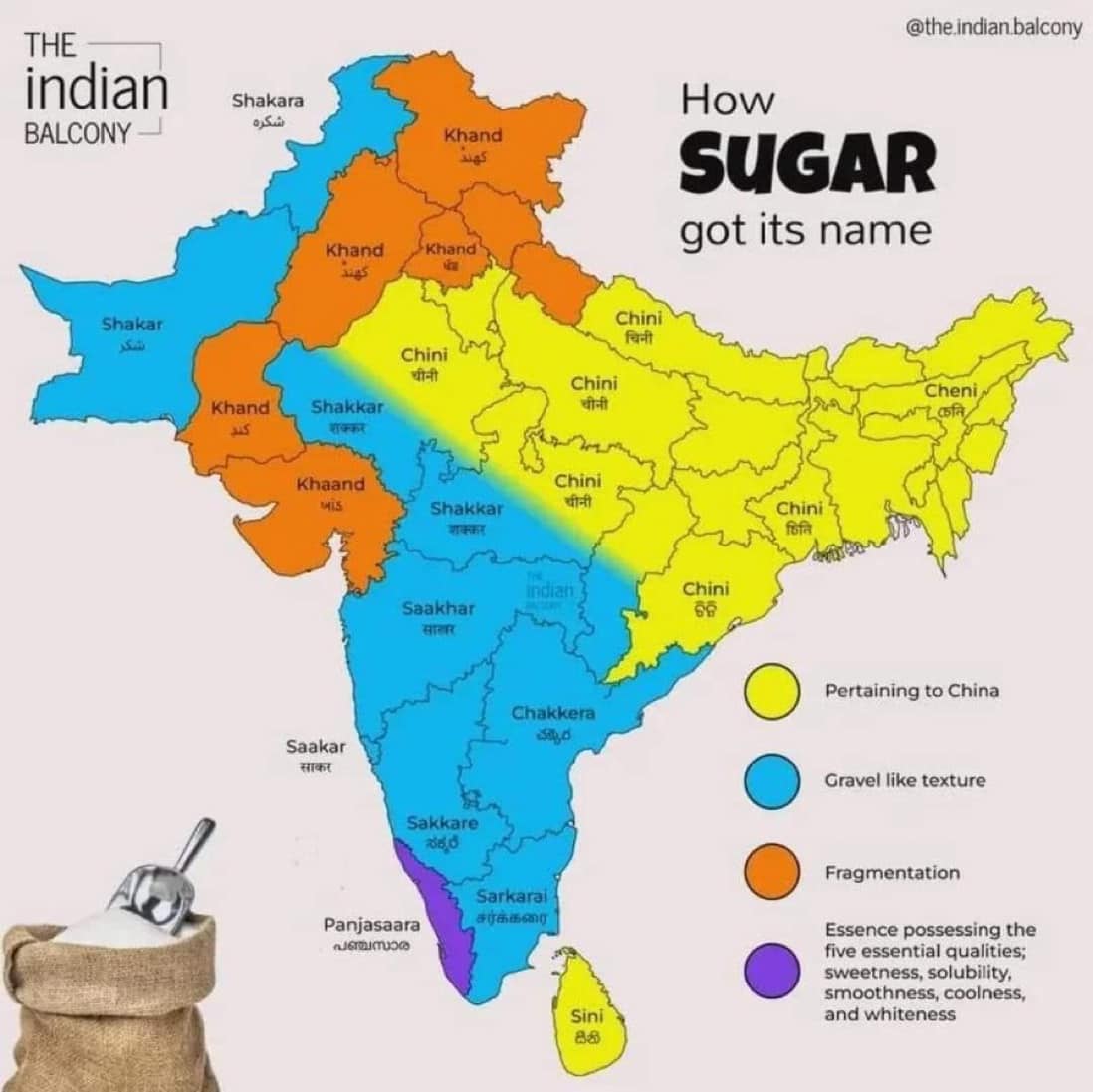 Here is a fun history with sugar. The English name for sugar comes from Latin succaram from Persian Shakar that in turn comes from the Sanskrit word Shakara. why? Because sugar as a stand-alone product was first invented in India.