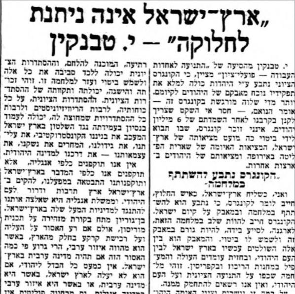 По рассказам, в конце 40-х, во время обсуждения своих международных усилий, Бен-Гурион спросил у Ицхака Табенкина, одного из отцов-основателей Киббуцного движения и будущей партии Мапай, что он думает про раздел Эрец-Исраэль.
