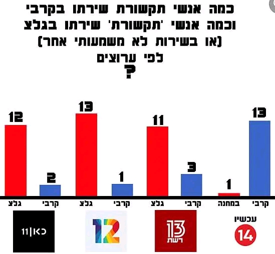На диаграмме вы видите, что практически все журналисты 11, 12 и 13 канала ИТВ служили НЕ в боевых частях (синий), а на армейском радио (красный). И только на правом 14 канале почти все - в боевых.
